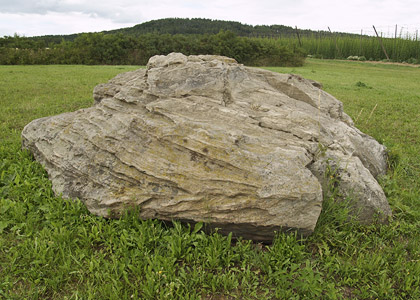 Ale pak zahlédneme vpravo u silnice, v louce poblíž chmelnice něco podivného. Leží tu asi metr vysoký křemencový blok, jehož bloky jsou členěny řadami podélných rýh a plochý vrchol se rozvírá úzkou oválnou mísou. Třpytí se v ní hladina čiré , překvapivě studené vody a na dně této kamenné nádržky se lesknou mince. Hloubku neuvědomělé, a přesto vytrvale přežívající tradice, která nás nutí vhazovat cennosti jako oběti vodním duchům do skalních mis, si můžeme ověřit u každé městské kašny či fontány, ale v případě mutějovického kamene jde ještě o něco navíc.
